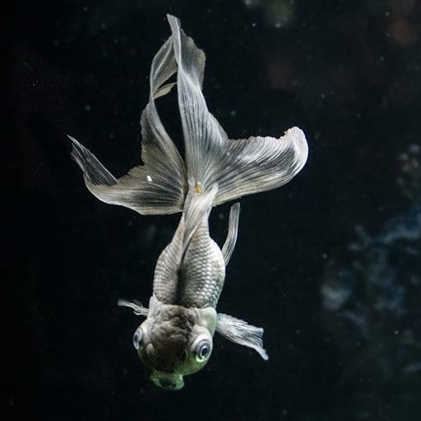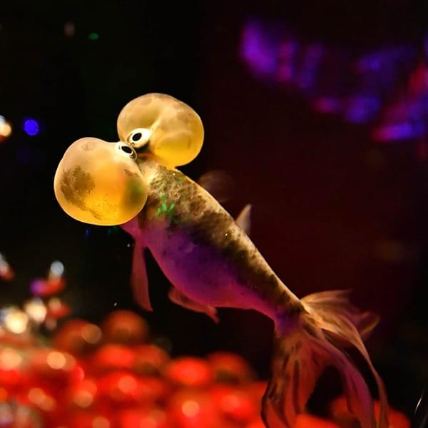 真上を向いた目と、背びれがない独特なフォルムが特徴です。出目金の突然変異とされており、視力の代わりに嗅覚が優れています。アートアクアリウム美術館の水槽作品の中を元気に泳いでいます。