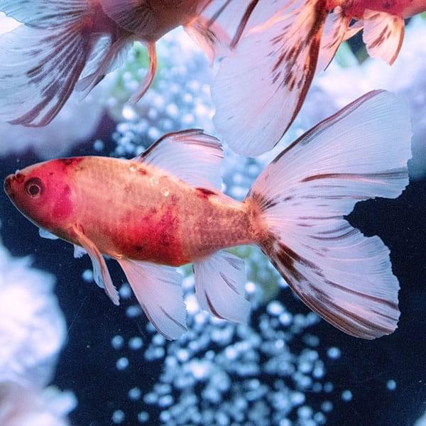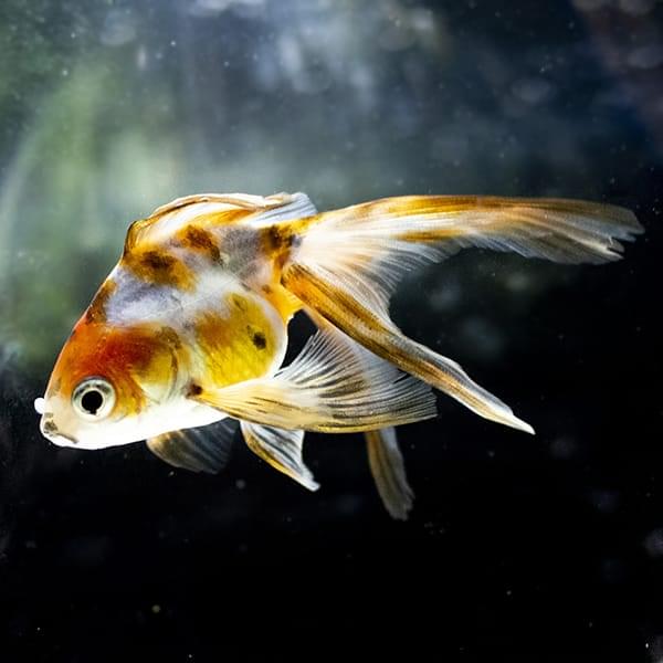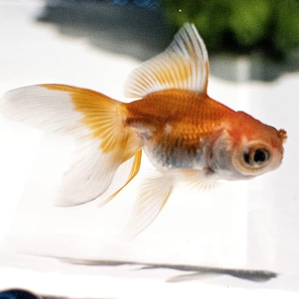 翅を広げた蝶のような尾ひれが特徴の中国原産金魚。左右に突き出した目は出目金にもよく似ています。更紗やキャリコなど、体色のバリエーションも豊富な品種。水流の穏やかな浅い水槽でのんびり泳いでいます。