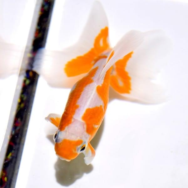 蝶尾と地金の交配で生まれた、扇形状に広がる蝶のような尾ひれが特徴。上見でも横見でもその美しい姿を楽しめます。2003年に作出された比較的新しい種類の金魚です。