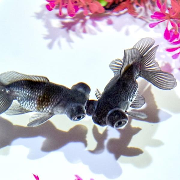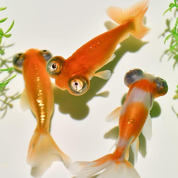 読んで字のごとく、眼が左右に飛び出した金魚。琉金の突然変異から生まれました。成長していくにつれて、徐々に眼が飛び出していきます。