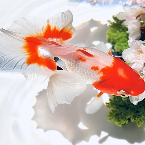 上からの鑑賞でその魅力が引き立つ、透明感のある白い体と赤いひれが特徴。口元は紅を差したように赤く染まっています。江戸時代中期に作出された起源の古い種で、愛知県の天然記念物に指定されています。