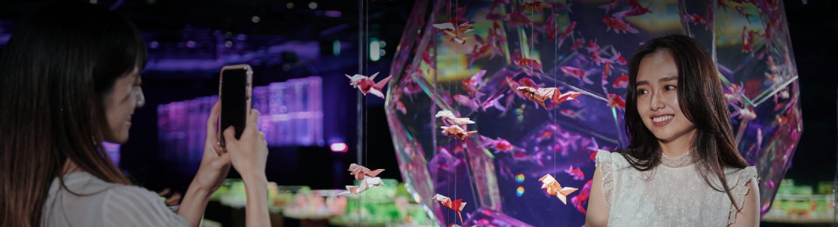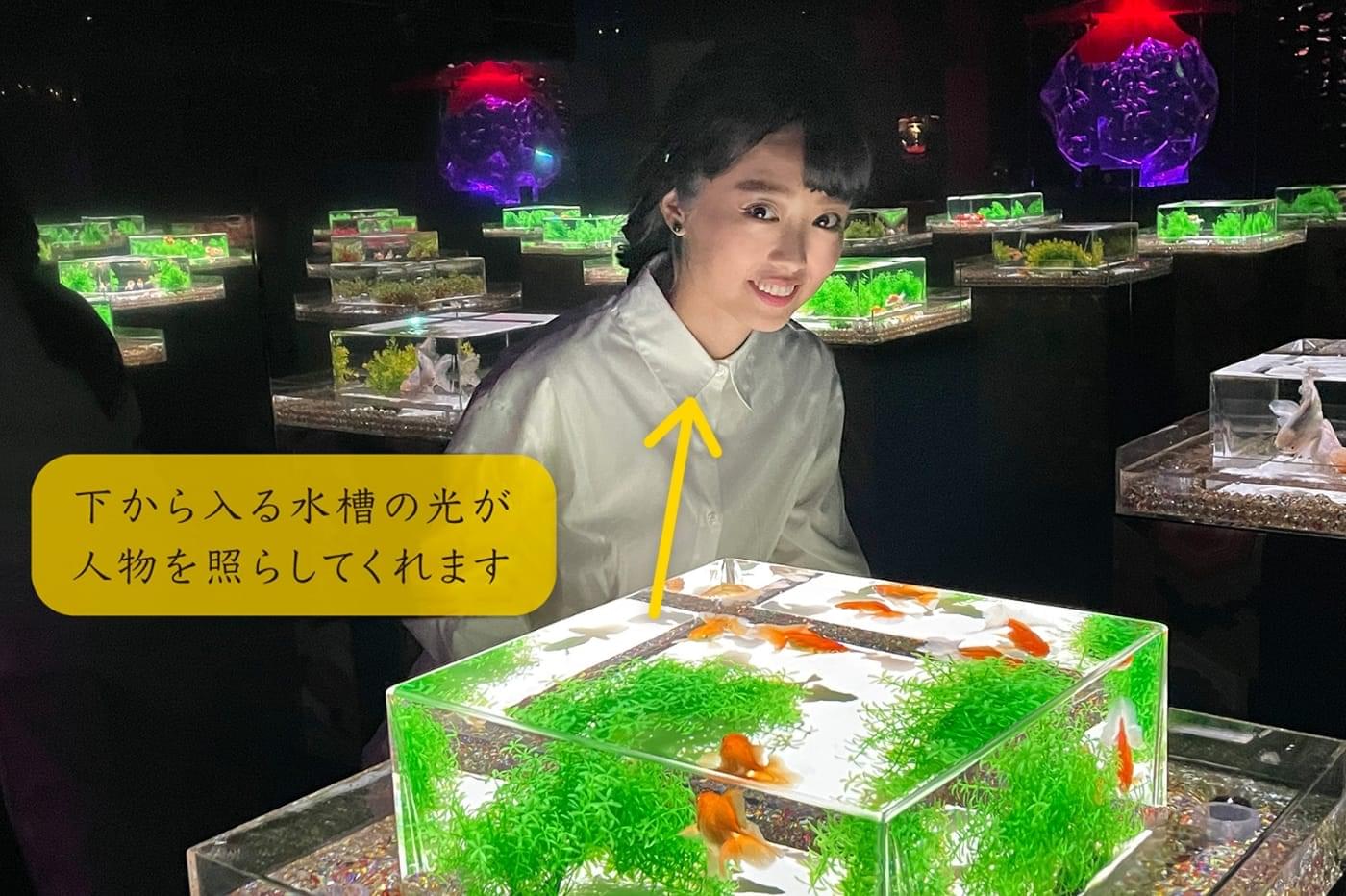 幻想的な写真が撮れるアートアクアリウム。ここでは、美しい空間や大切な人の一瞬を記録することができます。