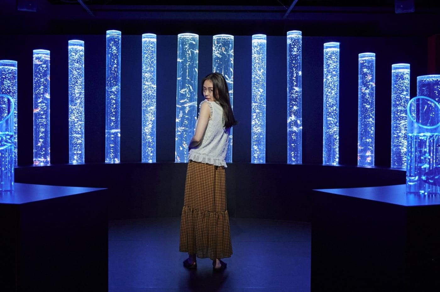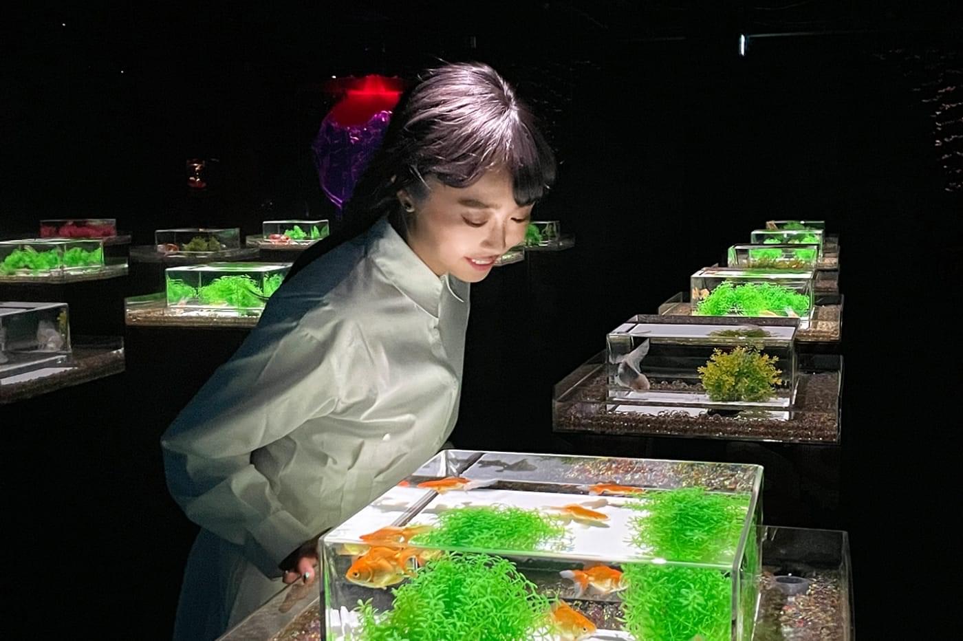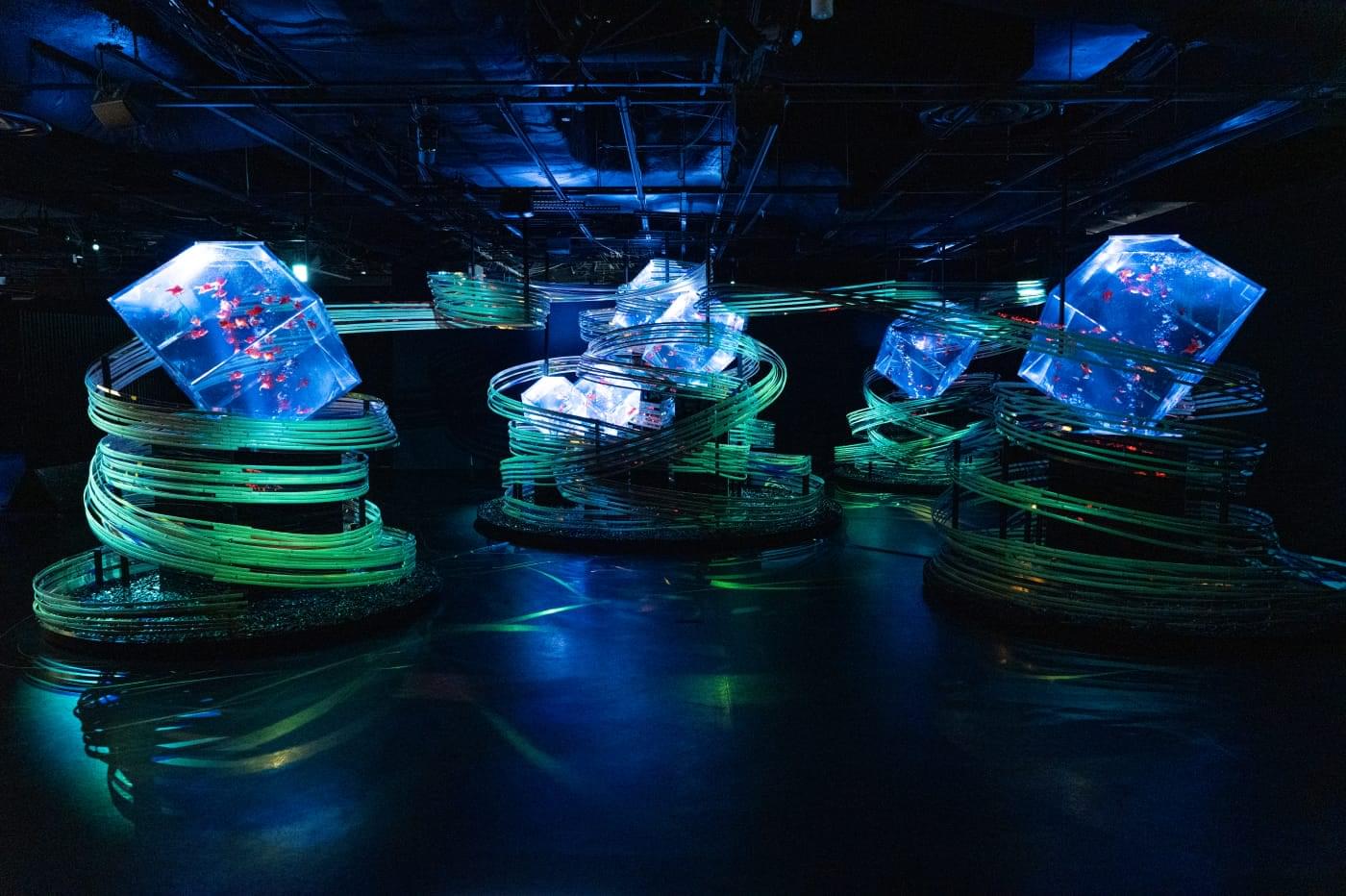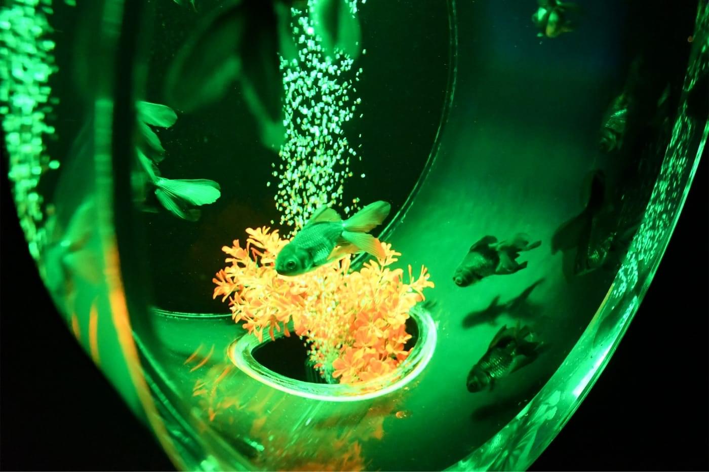 暗い空間の中様々な色合いで輝く水槽作品。その中の金魚が舞い泳ぐ世界では、水の反射によりその瞬間にしかみせない幻想的な美しい色彩が生み出されます。