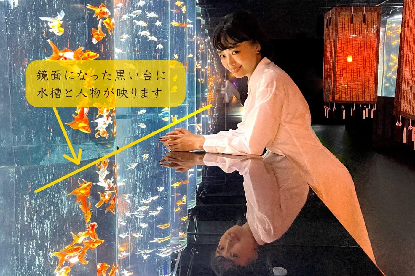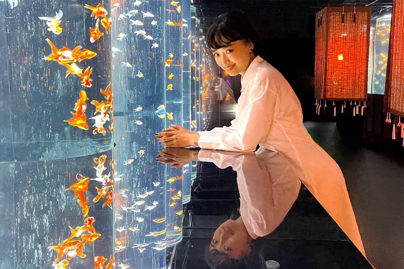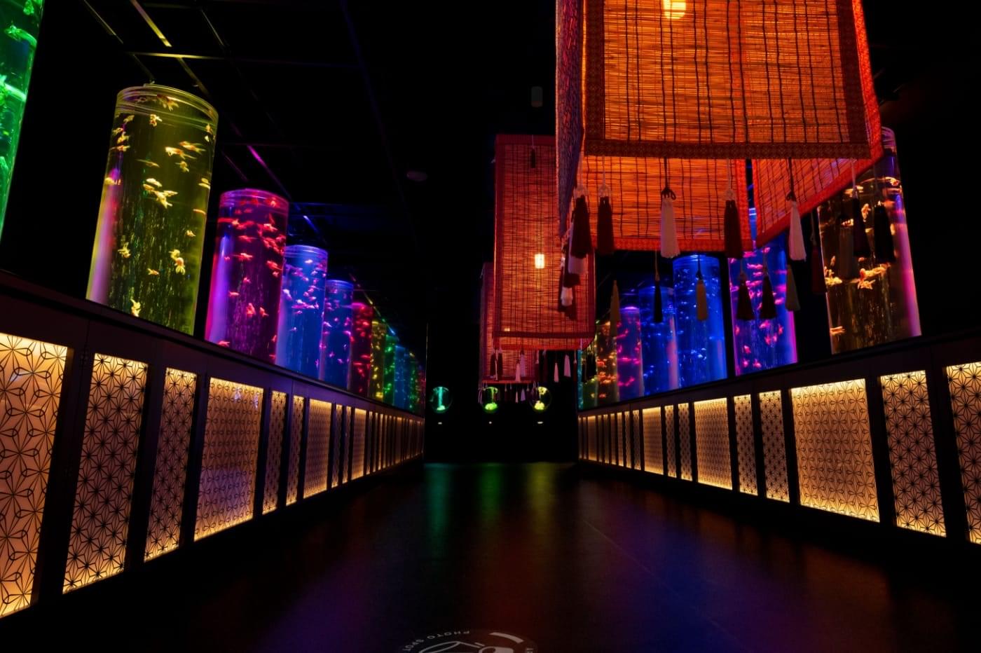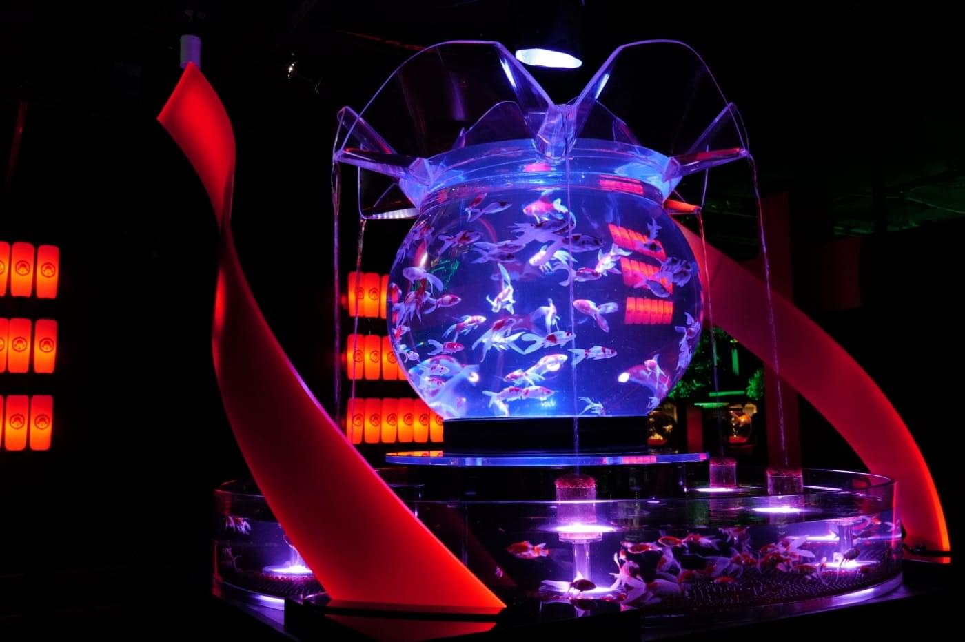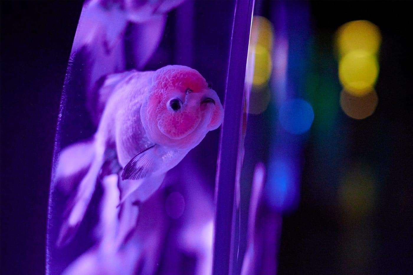 尾ひれの色や、光に照らされた金魚の美しい姿。金魚が泳ぐタイミングと幻想的な色彩が重なり合う、その一瞬を見つけてみてください。