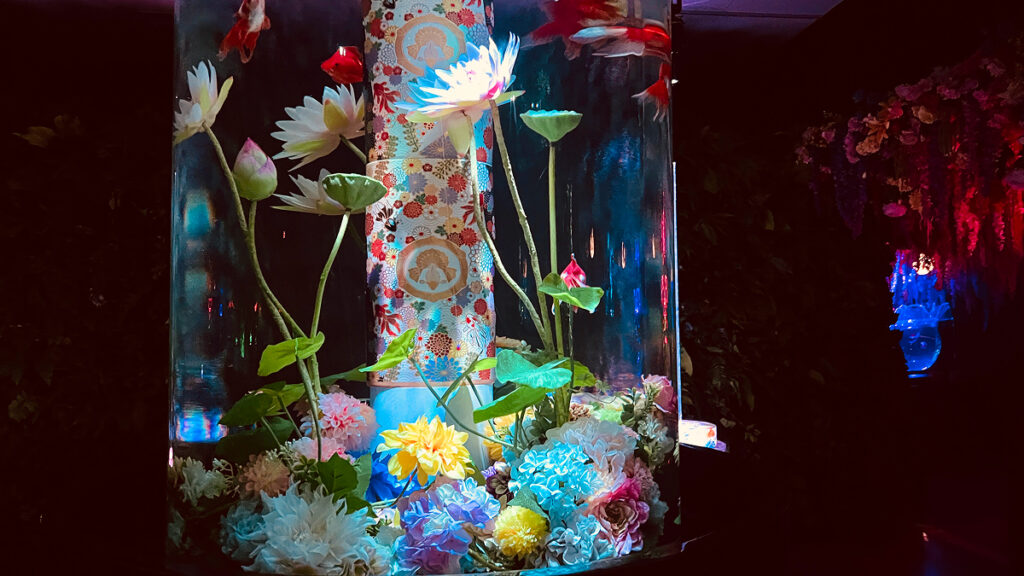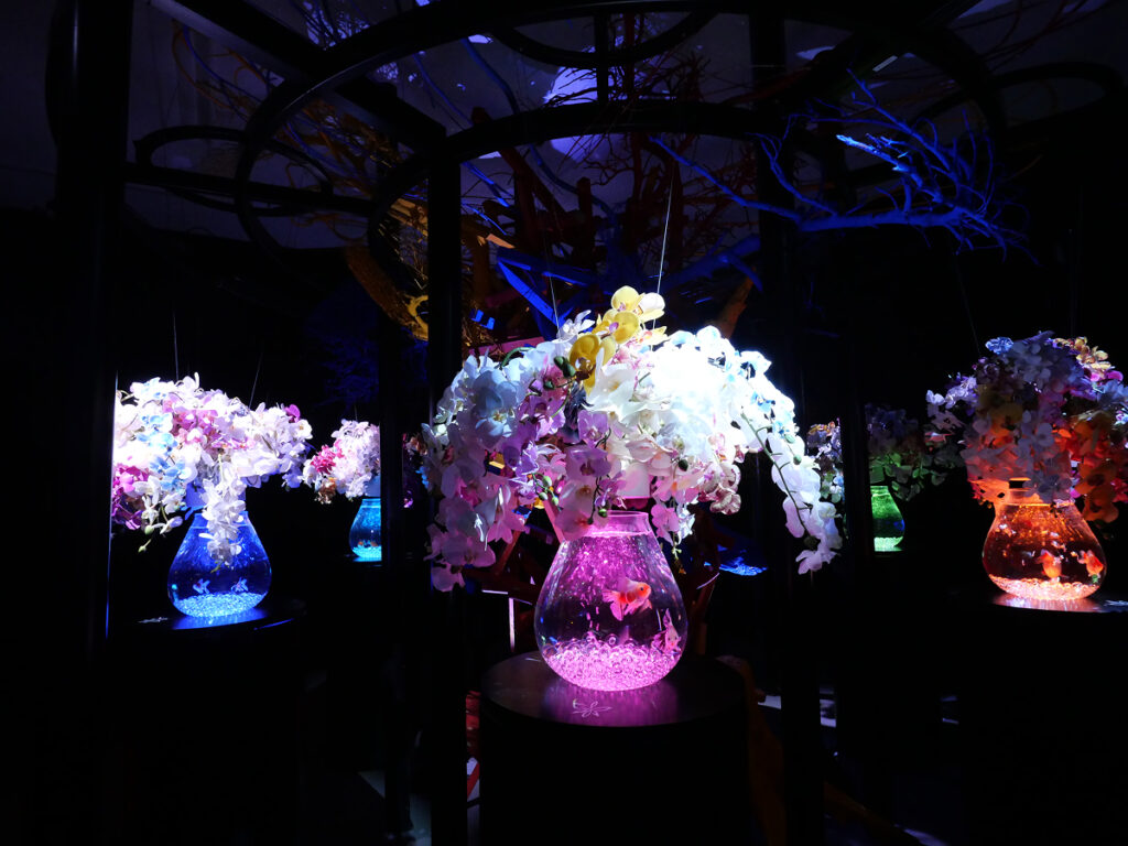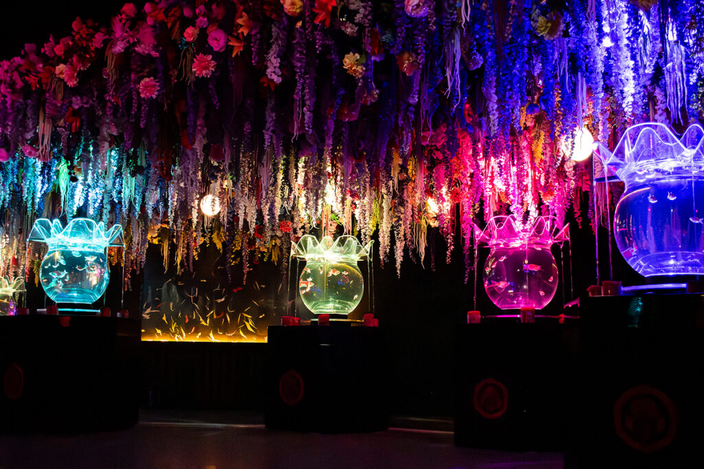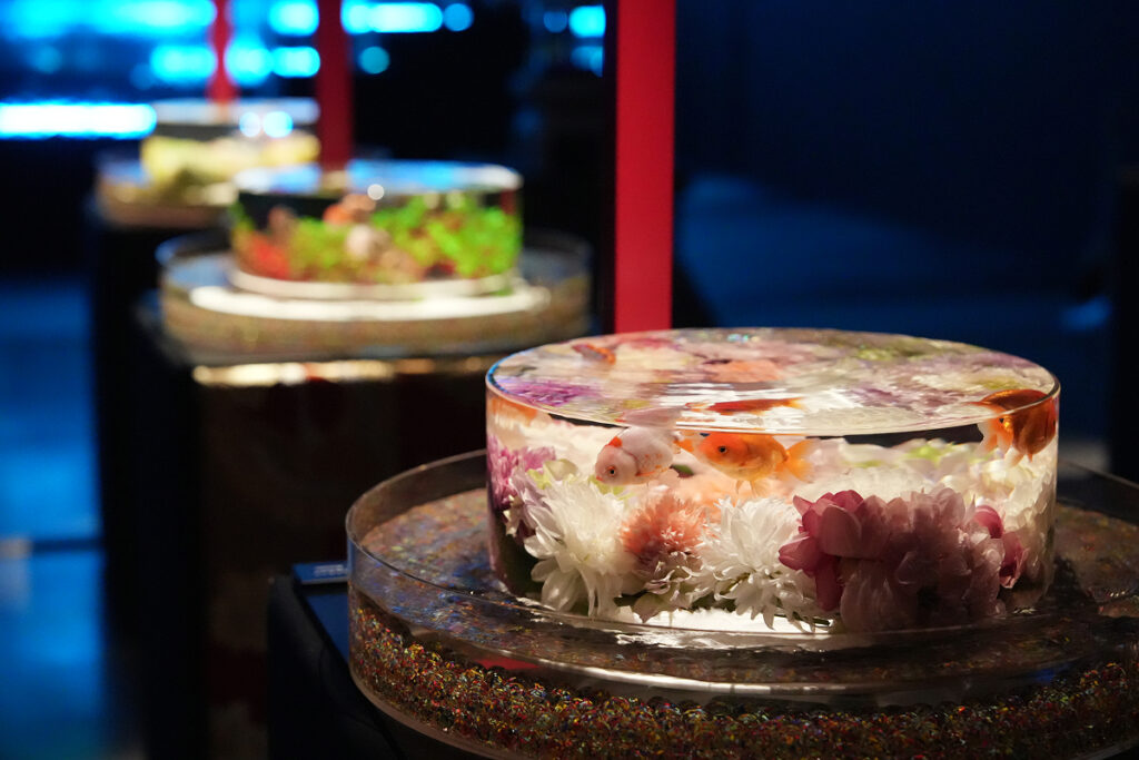 水槽作品“花魁”が並ぶ空間を様々な花で埋め尽くした華やかな空間作品。金魚×花の優美で華やかな空間が広がります。花に囲まれる、没入空間をお楽しみください。