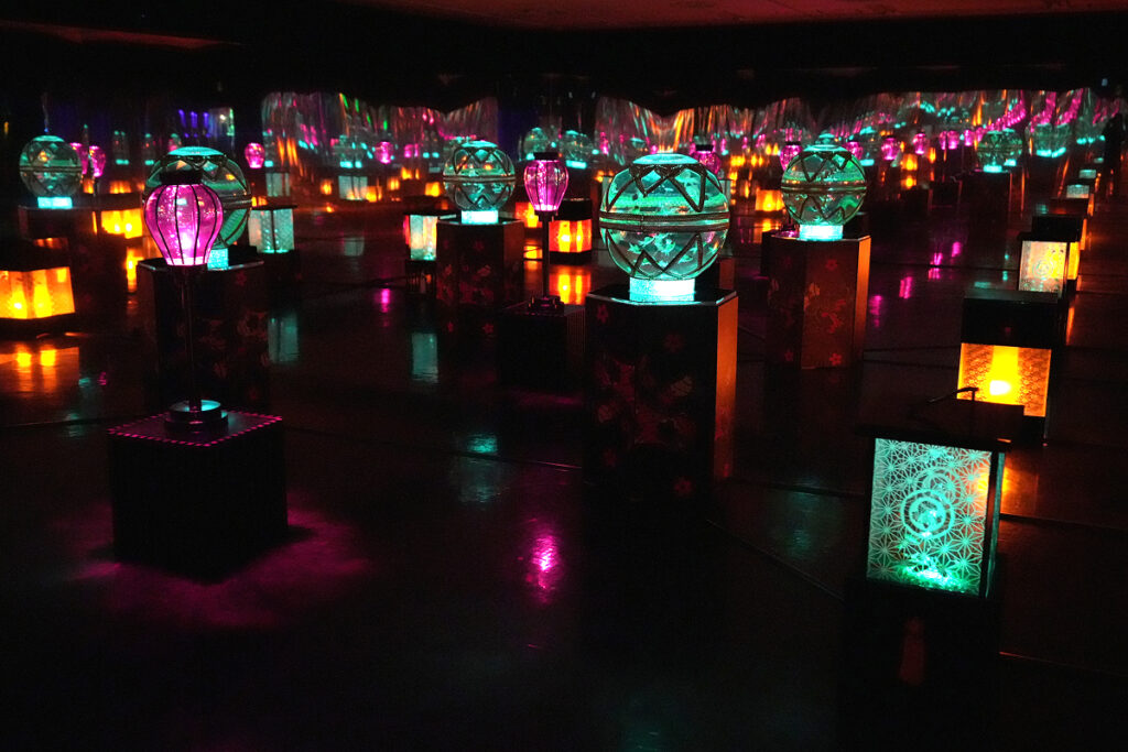 手毬、ぼんぼり、行燈をモチーフにした水槽作品が立ち並ぶ