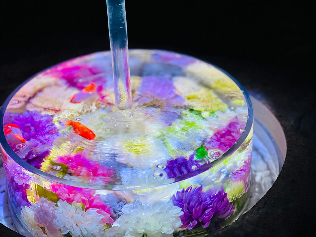 日本庭園に見られる装飾のひとつ、水琴窟(すいきんくつ)をモチーフにした水槽作品。水の流れと、鮮やかに彩る花々が、伝統的な趣を表現します。