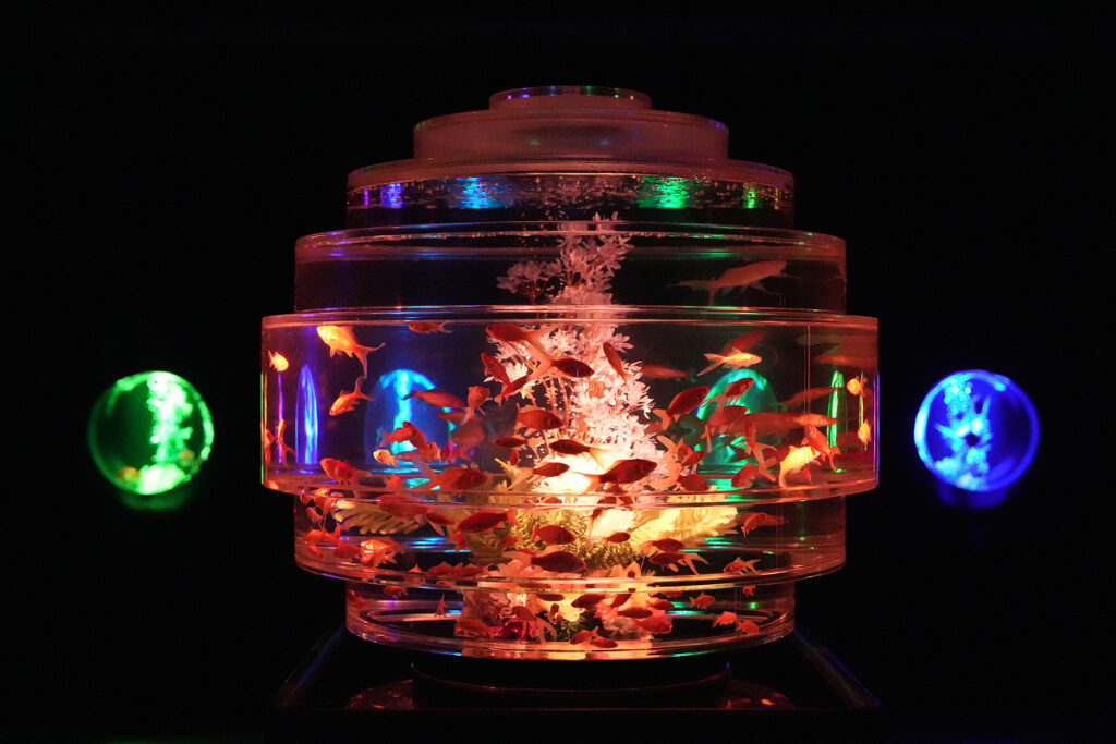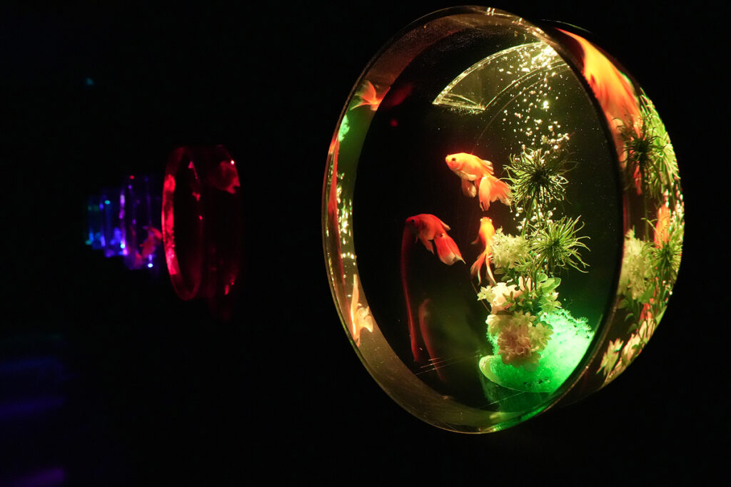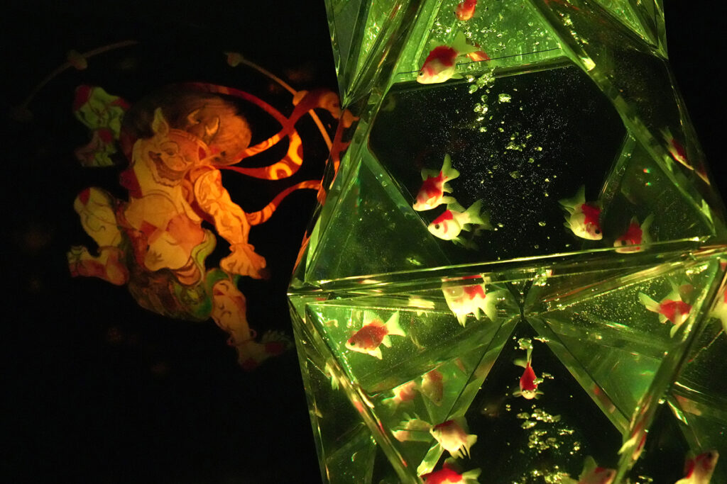 江戸時代にはガラスやダイヤモンドなど、キラキラしたものを「ギヤマン」とよんでいました。多面体の水槽作品が、金魚が織りなす空間をより幻想的に演出します。