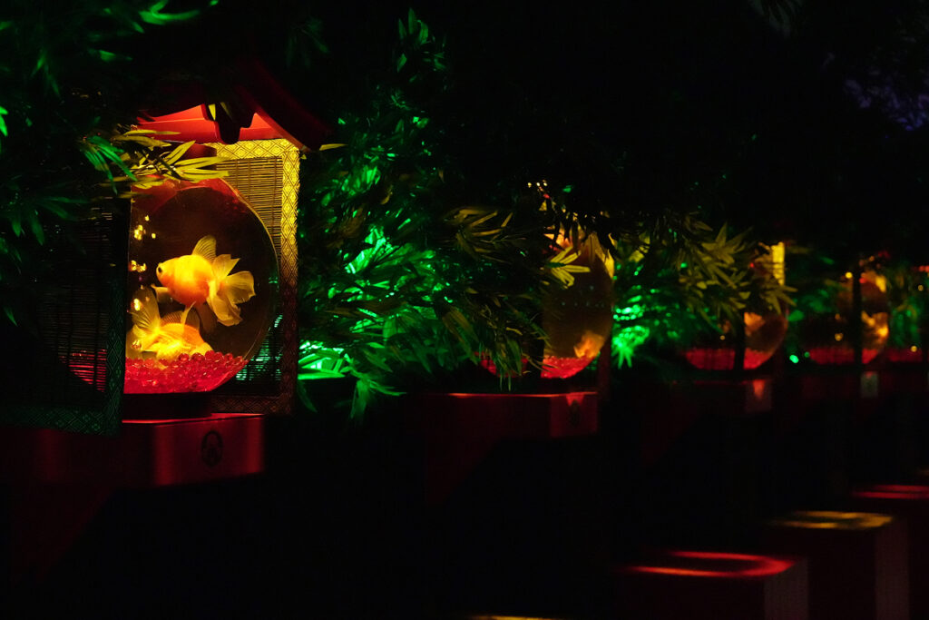 金魚泳ぐ水槽を提灯に見立て幻想的な街道を表現した空間。