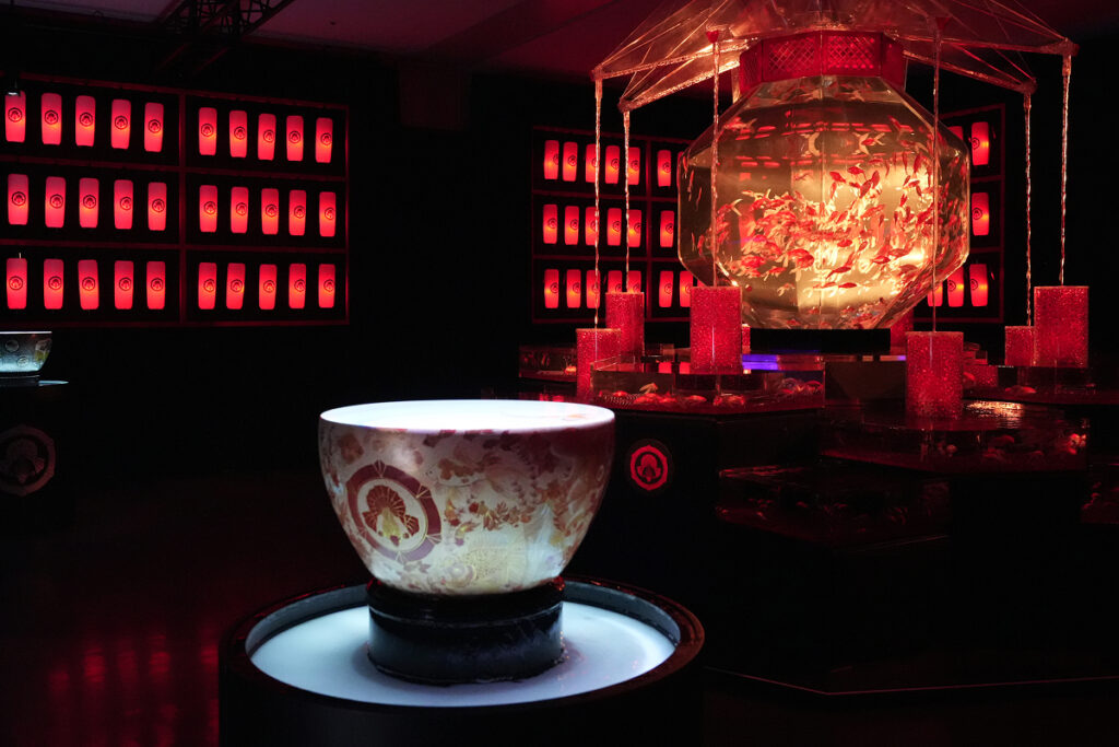 左右には伝統工芸“九谷焼”で制作された金魚品評。鮮やかな色彩と華やかな絵付け、さらにアートアクアリムの家紋が描かれた陶器の中を金魚が優雅に泳ぎます。