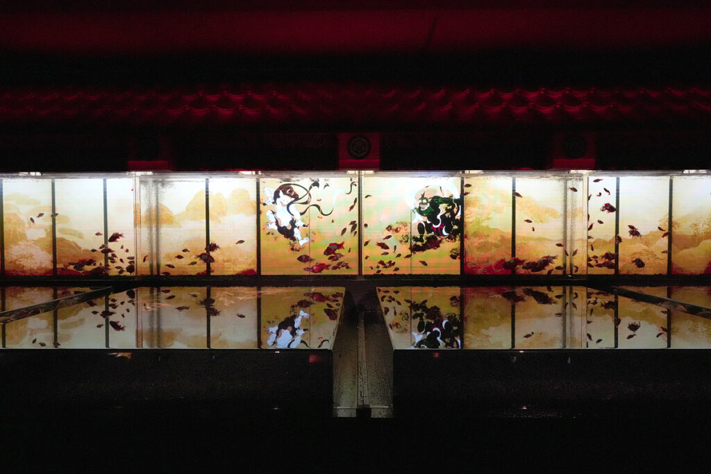 金魚の魚影と水盤に移る四季の景色をお楽しみください。