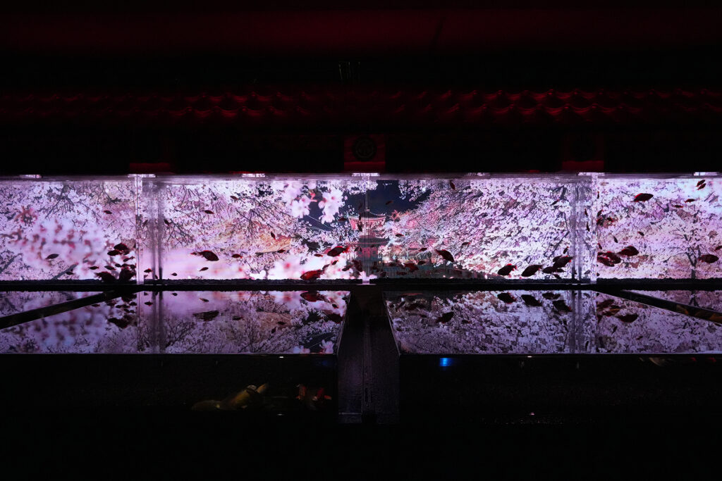 絵巻をモチーフにした新作水槽作品。背景に日本の四季を映し出し、そのなかを金魚が優雅に泳ぎます。