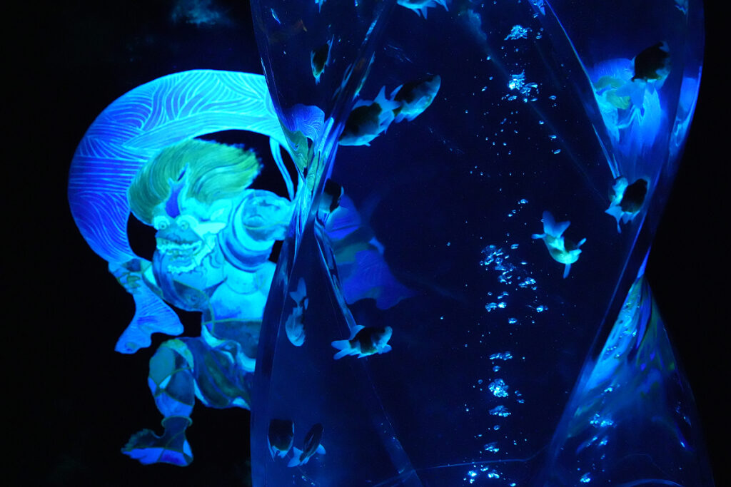 “風”と“雷”をイメージした水槽と、背景を飾る“風神雷神”で空間をダイナミックに演出する新作。日本美術に根付く“風神雷神”を、アートアクアリウムならではの水槽作品として表現します。