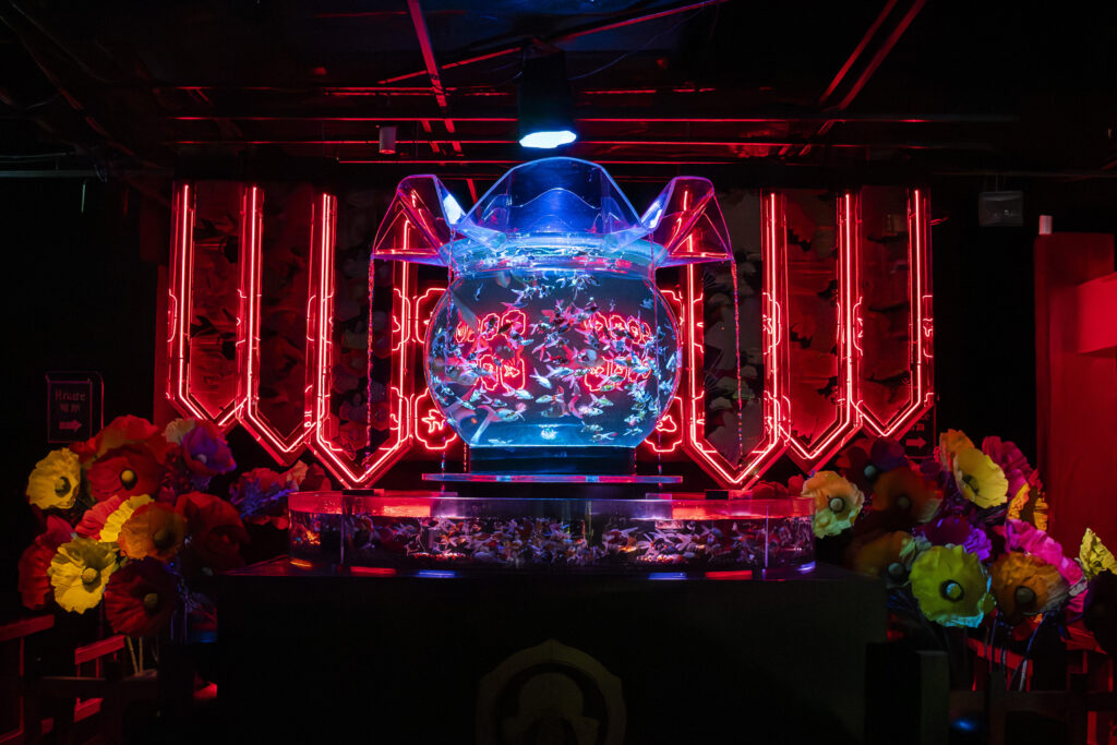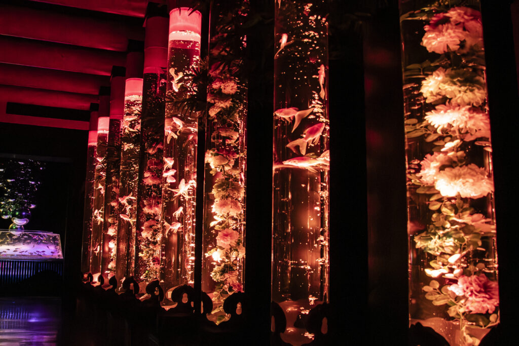 假屋崎氏:「水槽作品「花魁」が持つ、きらびやかな世界観は「華」の精神に通じるものがあります。この空間とコラボレーションするにあたり大切にしたのは、「金魚の命の躍動」と「花の生命の輝き」を融合させることでした。金魚が泳ぐ水の世界と、花が咲き誇る世界が混じり合い、この世のものとは思えない幸福感に包まれるような空間を創作しました。」