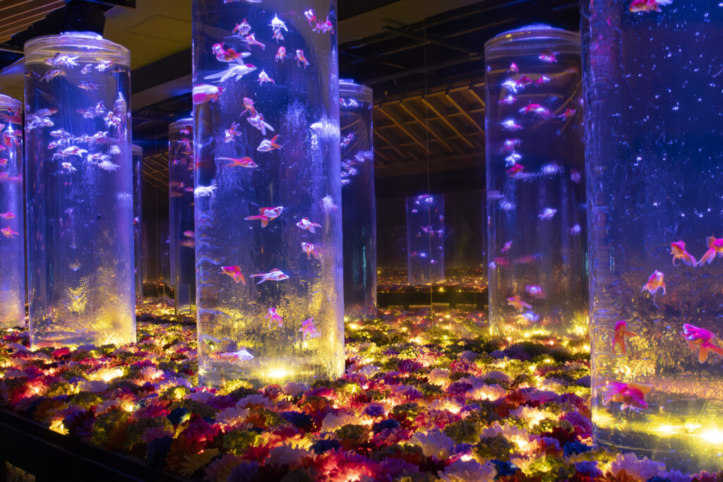 水槽作品“花魁”が並ぶ空間を様々な花で埋め尽くした華やかな空間作品。金魚×花の優美で華やかな空間が広がります。花に囲まれる、没入空間をお楽しみください。
