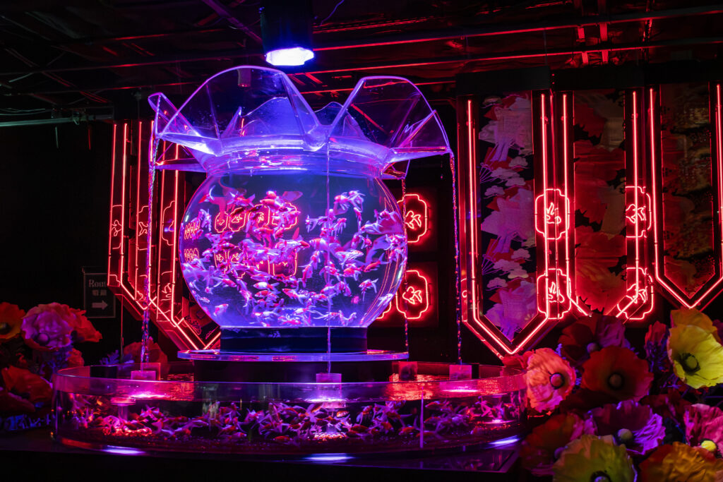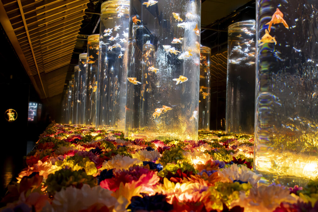水槽作品“花魁”が並ぶ空間を様々な花で埋め尽くした華やかな空間作品。金魚×花の優美で華やかな空間が広がります。花に囲まれる、没入空間をお楽しみください。