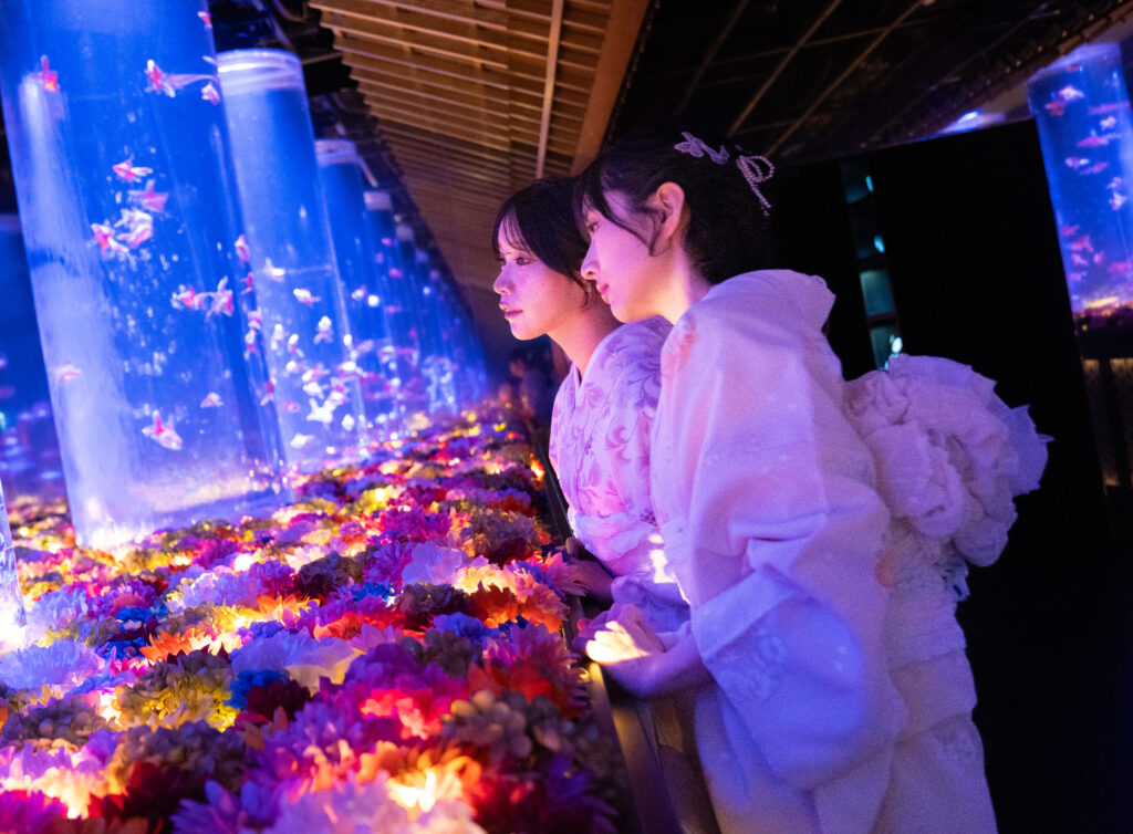 現在開催中の特別企画「Flower Aquarium Gala ~金魚と花の彩展~」を、着物姿でより華やかにお楽しみいただけます。